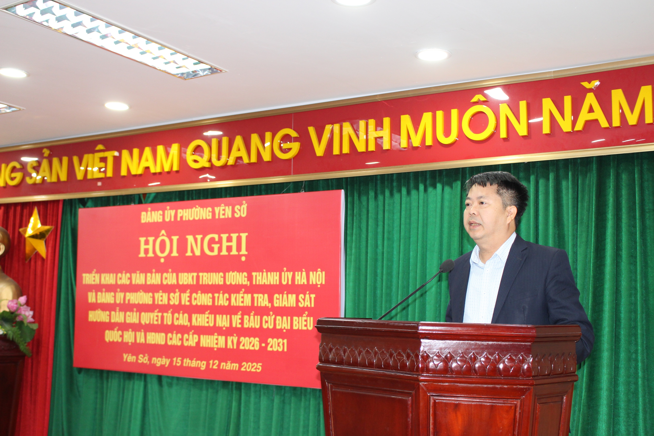 Sáng 15/12/2025, Phường Yên Sở tổ chức hội nghị triển khai các văn bản của TW, Thành phố, Đảng ủy Phường về công tác kiểm tra, giám sát của Đảng hướng dẫn giải quyết đơn thư tố cáo khiếu nại phục vụ bầu cử quốc hội và HĐND các cấp nhiệm kỳ 2021-2026, báo cáo kết quả hoạt động KTGS năm 2025 và phương hướng nhiệm vụ năm 2026