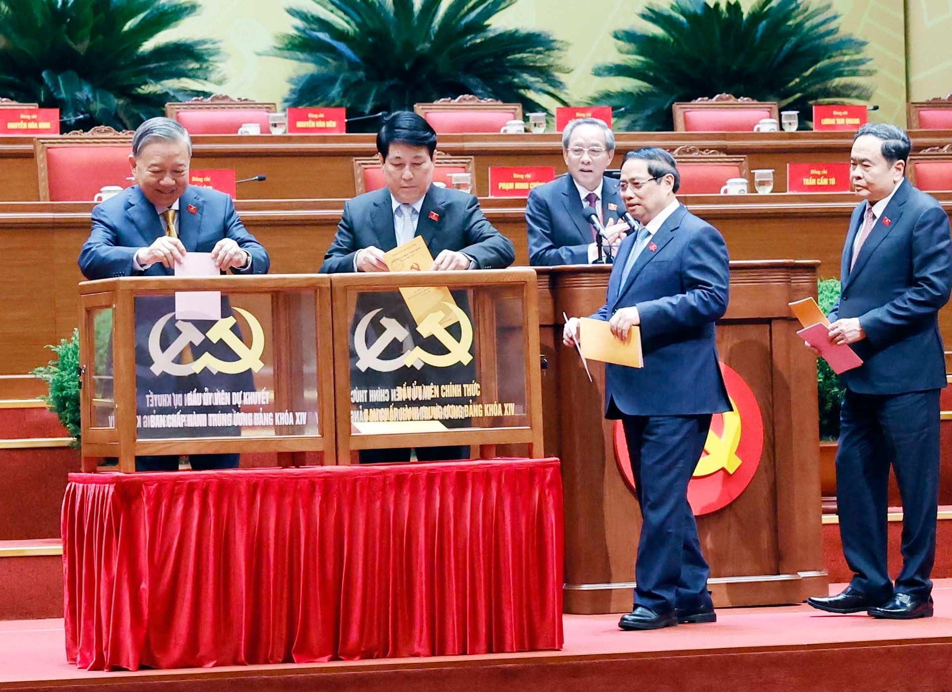 Tổng Bí thư Tô Lâm cùng các đồng chí lãnh đạo Đảng và Nhà nước bỏ phiếu bầu Ủy viên Trung ương chính thức và Ủy viên dự khuyết Ban Chấp hành Trung ương Đảng khóa XIV. Ảnh: ĐH